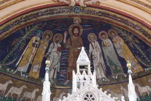 写真4は天蓋の上のドーム型の天井を飾っているモザイク画です。描かれているのは、向かって右から順に聖アガタ、聖ヴァレリアヌス、聖ペテロ、キリスト(中央)、聖パウロ、聖チェチリア、パスカリス1世で、その下に描かれている羊は十二使徒を表すとのことです。