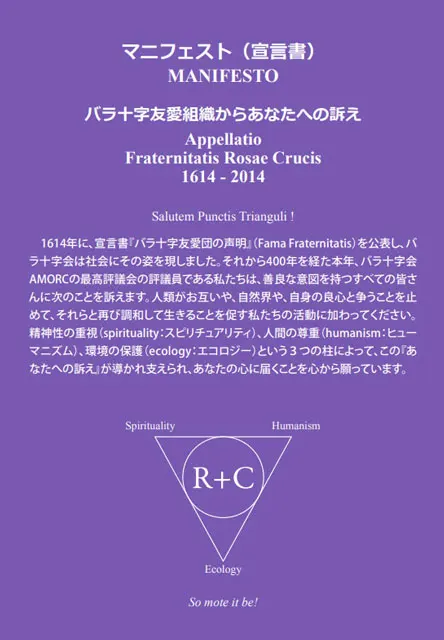 人類がここ数十年直面している多くの分野での危機を克服して、前途有望な未来を築くためには、精神性(spirituality:スピリチュアリティ)の重視、人間の尊重(humanism:ヒューマニズム)、そして環境の保護(ecology:エコロジー)の3つを、社会が選択してその基礎としなければなりません。このことはまさに、2016年に世界中で発表された当会の宣言書『バラ十字友愛組織からあなたへの訴え』(Appellatio Fraternitatis Rosae-Crucis)のテーマになっています。